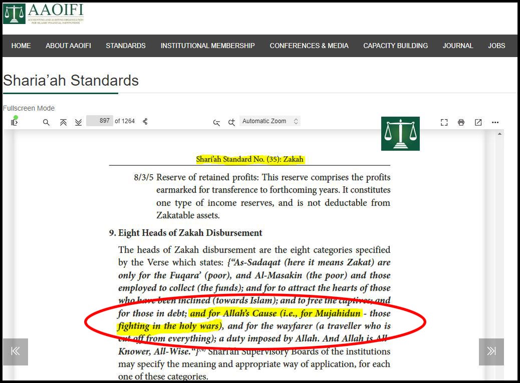 Islam is not the only religion to obligate a form of charity, but it is the only one in which financing jihad is not only legitimate, as per Sharia accounting standards, but also sanctified in the foundational doctrine.